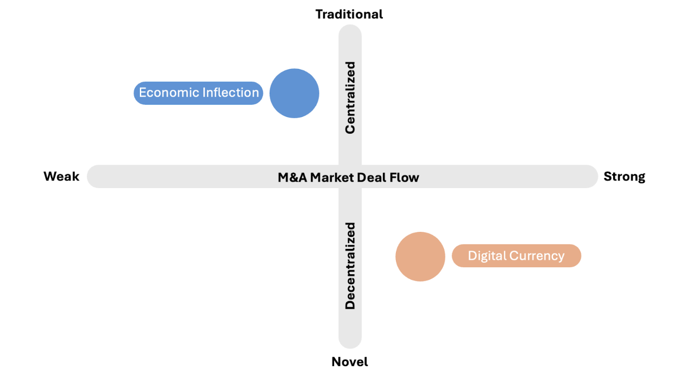Scenario Planning helps prepare an organization for plausible futures. As an example, a matrix provides a helpful visualization of the scenario interface (Figure 1). Here, the x-axis measures whether or not the M&A market will weaken or strengthen. Simultaneously, the y-axis considers shifts in both the US and Global financial markets from centralized to decentralized. Both ‘economic inflection’ and ‘digital currency’ are plagued by turbulence, uncertainty, and ambiguity. Clearly, though, ‘Digital Currency’ presents a more novel scenario. By ensuring that today’s M&A strategy, and your business succession strategy, includes considerations around changes to the external environment, you can build flexibility into your holistic financial plan.